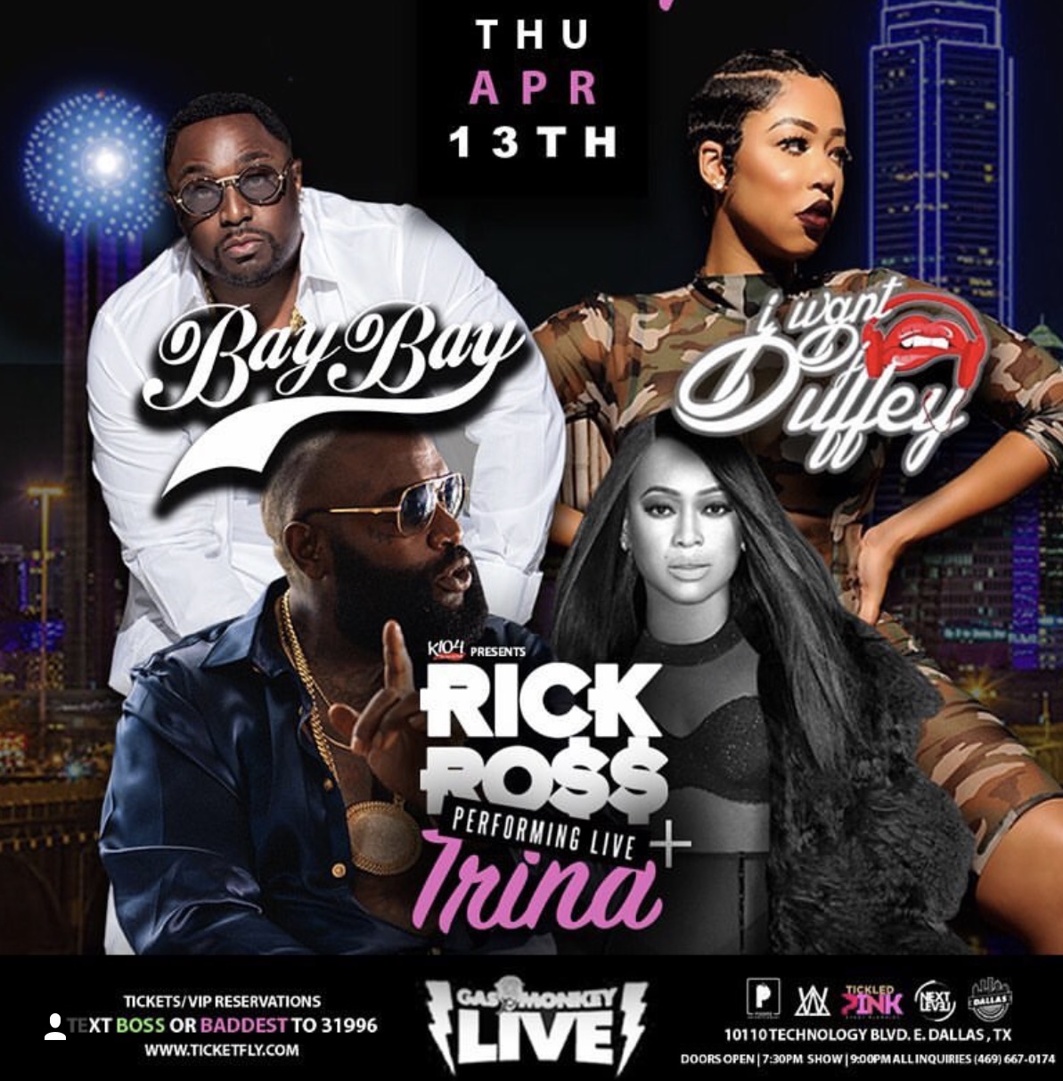 Ticket prices to see Rick Ross and Trina start at $55 and can be purchased online at ticketfly.com or at Gas Monkey Live. For VIP reservations, text “BOSS” or “BADDEST” to 31996. Doors open at 7:30 p.m. and the show begins promptly at 9 p.m.